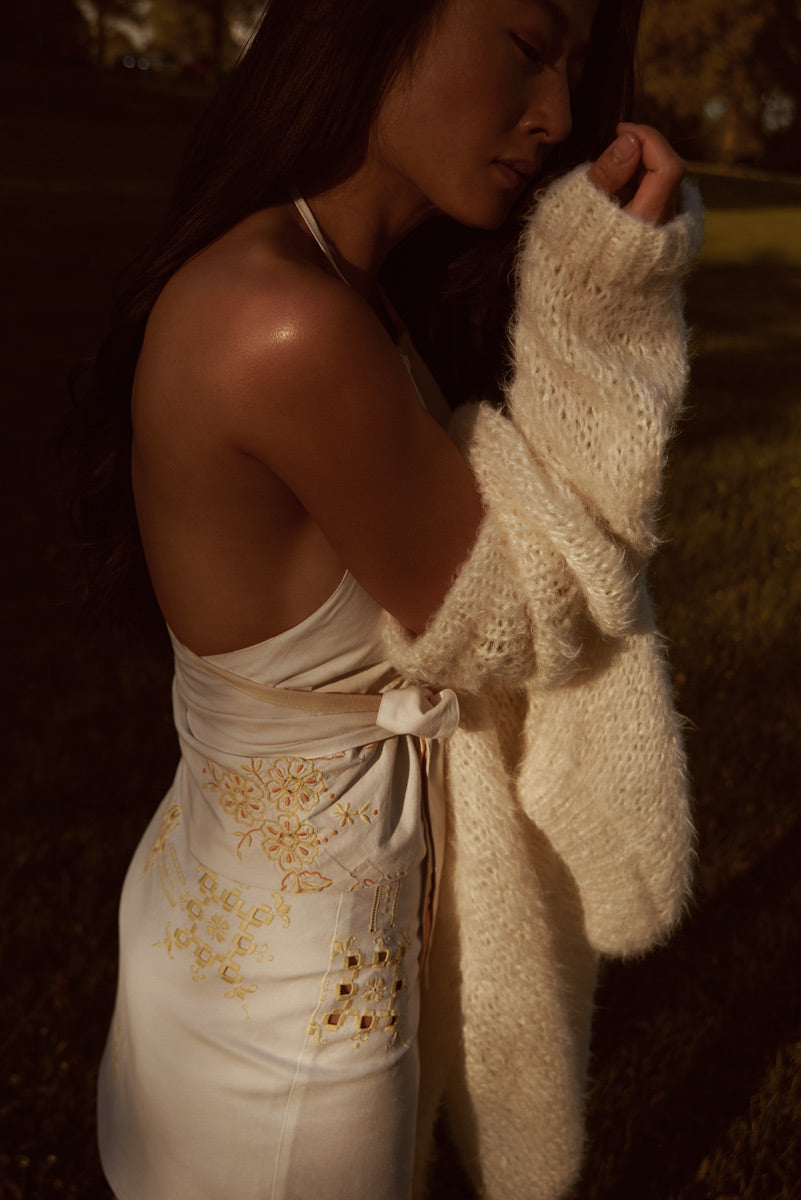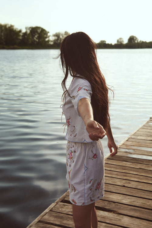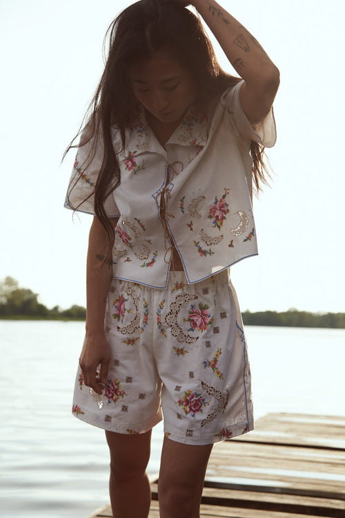 Each piece is hand cut and finished individually to bring our center of attention to the details in the embroidery and laces of the one-of-a-kind fabrics.